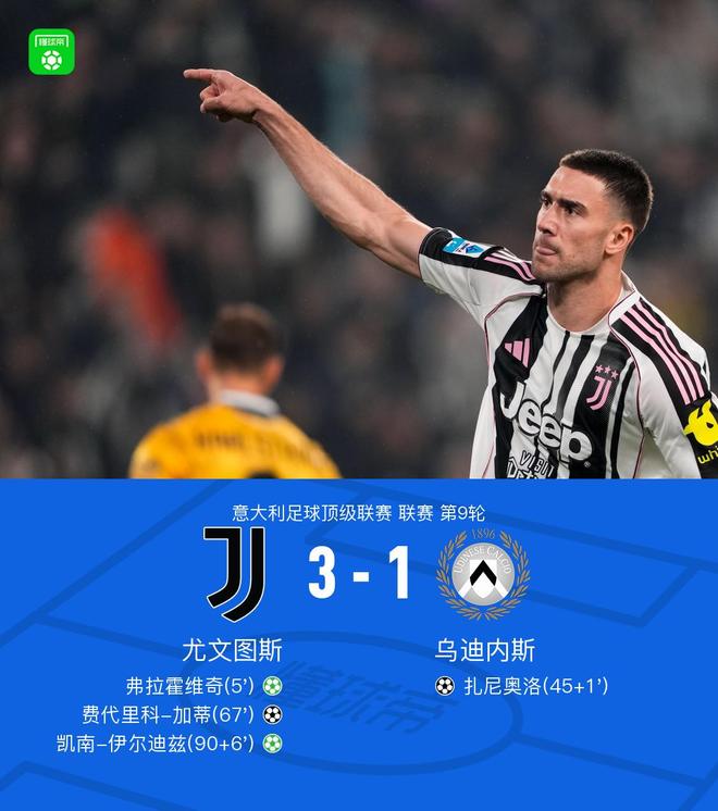 北京时间10月30日,意大利足球顶级联赛第9轮,尤文图斯坐镇主场迎战乌迪内斯。上半场弗拉霍维奇造点,随后亲自主罚命中,半场补时阶段扎尼奥洛禁区内调整后破门。下半场坎比亚索传中,加蒂头球破门再度领先,补时阶段伊尔迪兹造点,随后亲自主罚命中锁定胜局。最终尤文3-1战胜乌迪内斯结束8场不胜。
