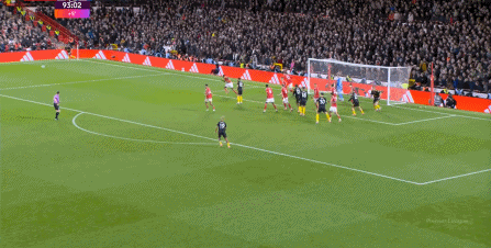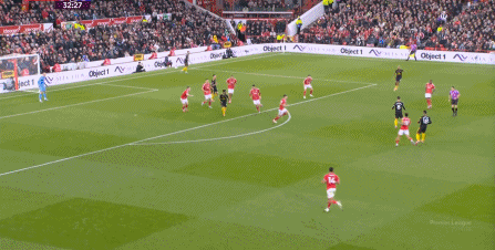 第48分钟,诺丁汉森林左右调动曼联,在右侧禁区角的位置起脚传中,欺负到了阿玛德-迪亚洛的头顶: