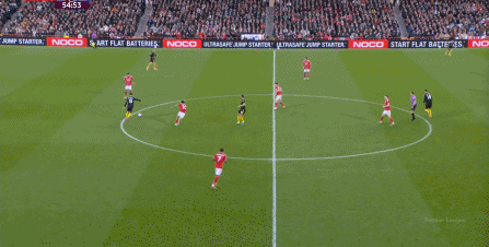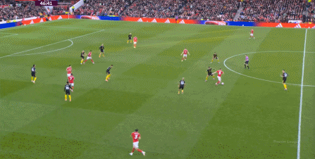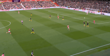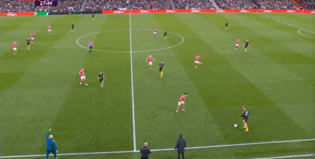 于是,最近这段时间看起来很好用的体系,在运转上出现了明显的问题,球队的进攻需要另辟蹊径,所以在30分钟前后,是布鲁诺和库尼亚这一侧,通过转移到右侧,让曼联形成了进攻: